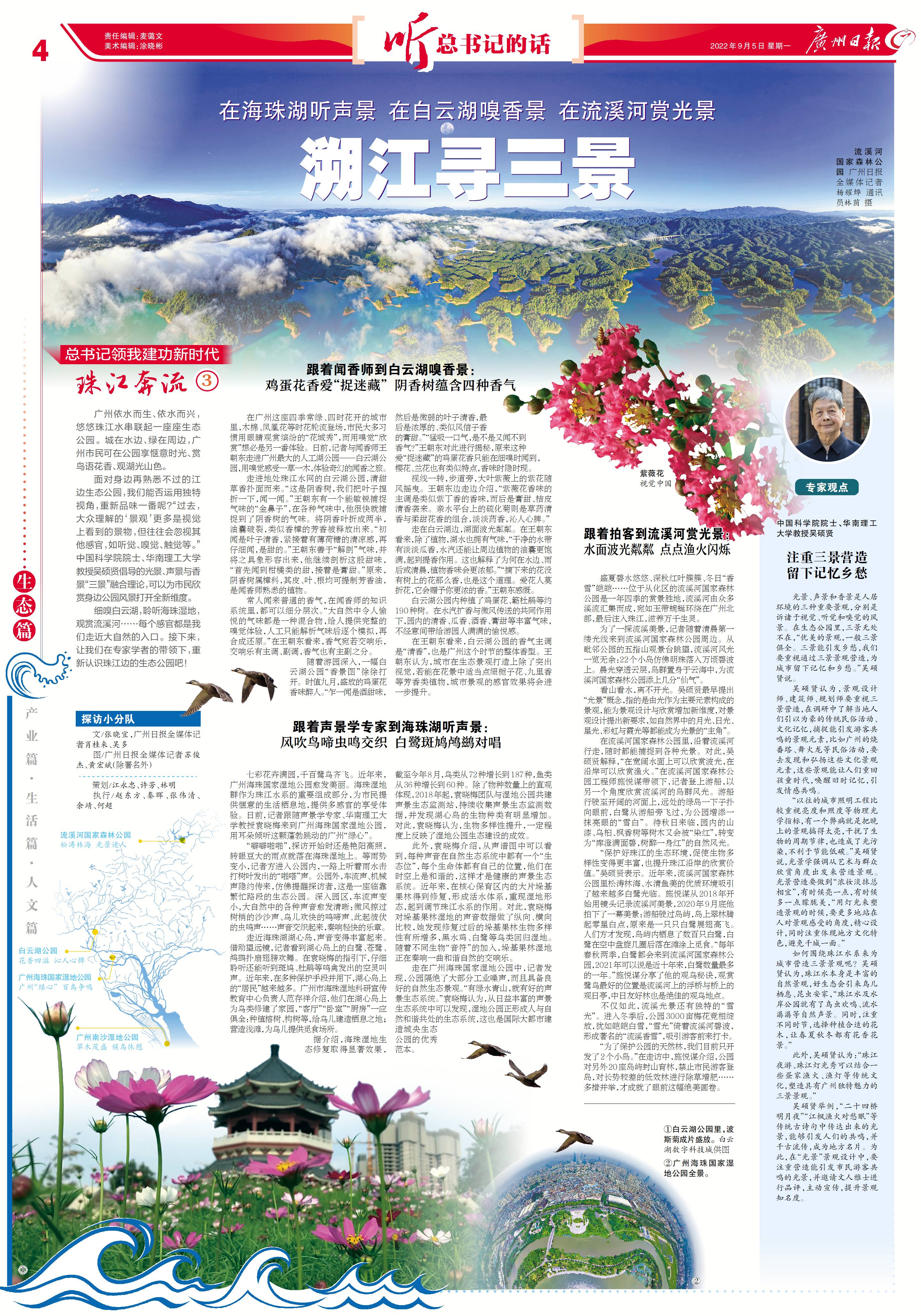 如何围绕珠江水系来为城市营造三景景观呢?吴硕贤认为,珠江水本身是丰富的自然景观,好生态会引来鸟儿栖息、昆虫安家,“珠江水及水岸公园就有了鸟虫欢鸣、流水潺潺等自然声景。同时,注重不同时节,选择种植合适的花木,让春夏秋冬都有花香花景。”