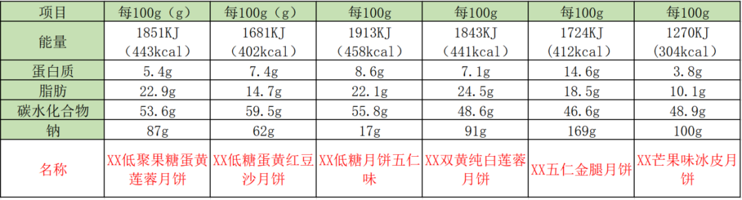 随机选取3款低糖月饼与3款普通月饼,营养成分表分别如下: