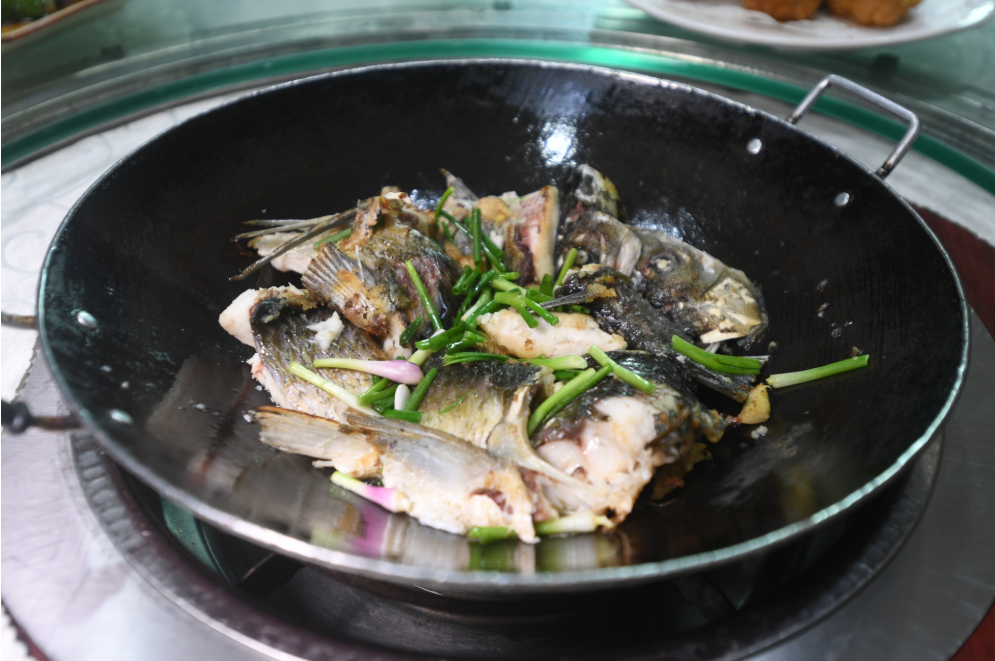 当鱼肉煎至七成熟,林师傅迅速淋下独特的九江双蒸,香味顿时在厨房四溢;再加盖焗上片刻,洒下葱段提香,便可上碟。
