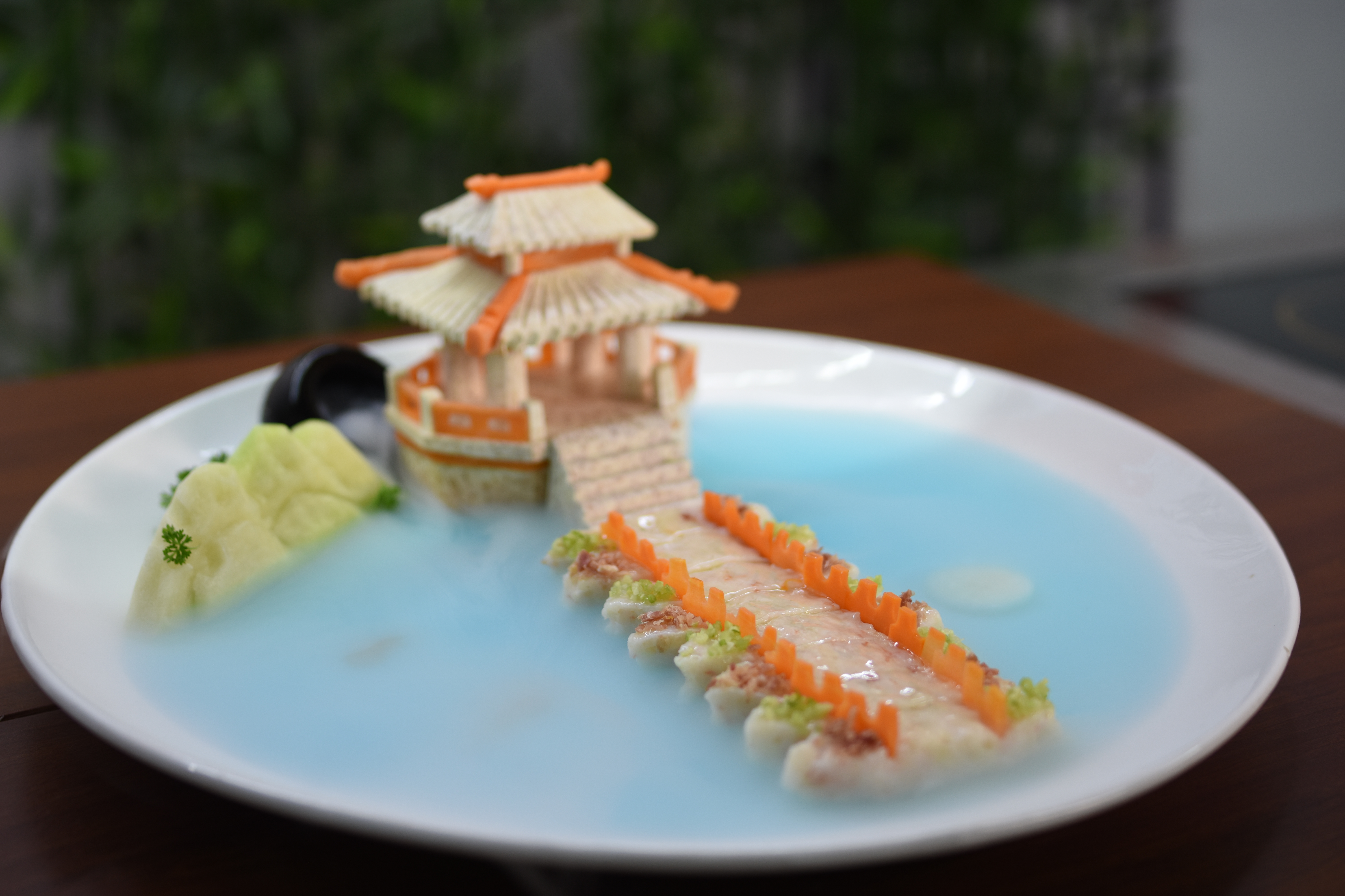 虾泥蒸熟后切成木船的形状,几艘“木船”相连,配上用芋头和胡萝卜雕刻而成的楼台,形似潮州广济桥。这是在传统潮州菜“湘桥春涨”的基础上加以创新的一道菜式,在‘水’中倒映一轮‘明月’,寓意中秋节团圆美满之意。
