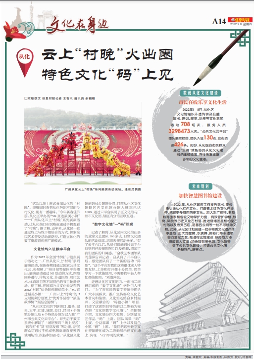 “这次以线上形式参加从化的‘村晚’,能够同时看到从化各地不同的乡村文化,别有一番趣味。”今年新春佳节前,从化区举办的“5G直达最美小镇”——广州从化云上“村晚”系列展演活动,让从化街口市民陈叔通过手机观看了“村晚”。据了解,近年来,从化区一直通过线上与线下相结合的方式,探索全民艺术普及活动新路径,打造立体化的数字资源宣传推广新模式。