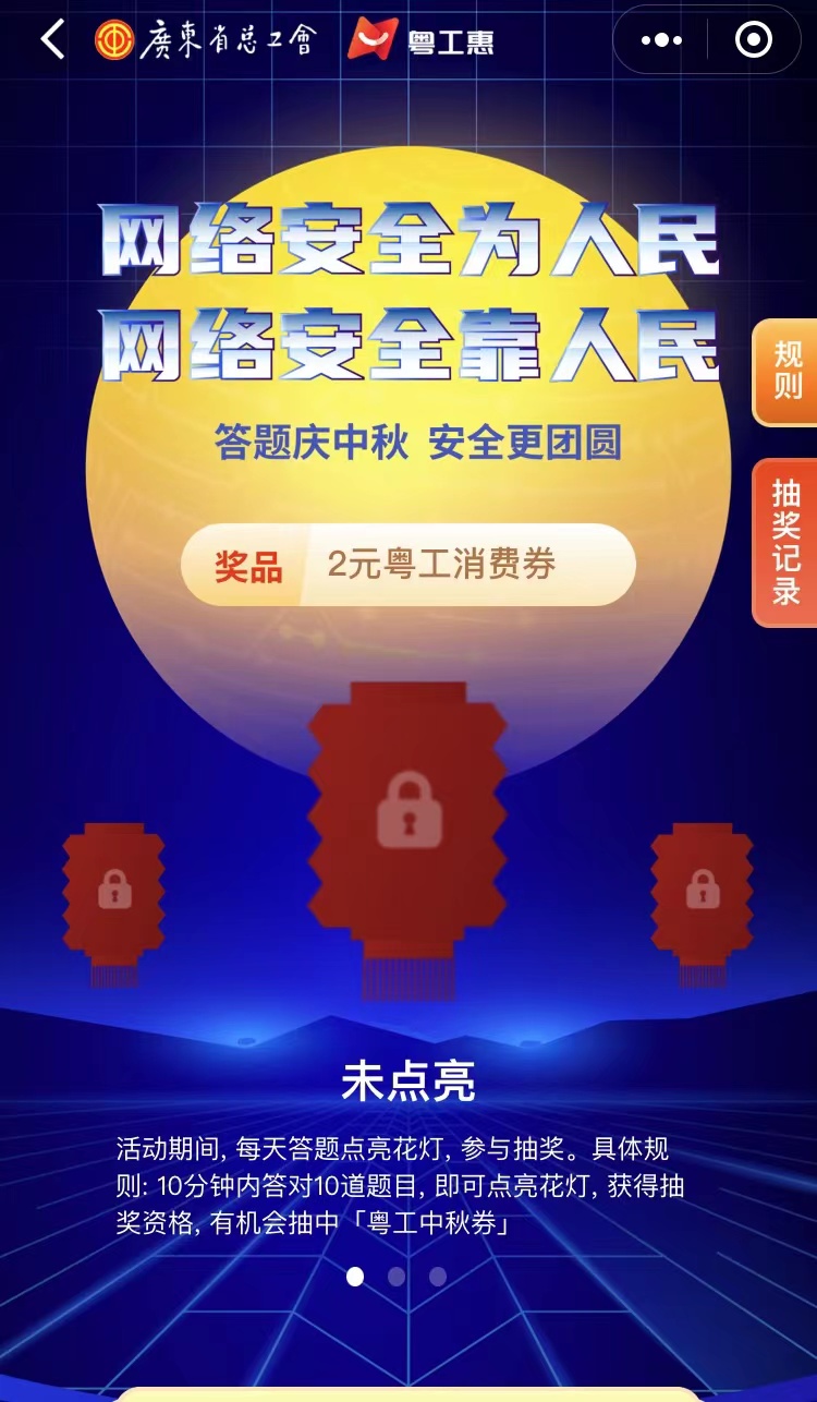 活动共持续3天,参与者只要在规定时间内答对10道题,即可点亮花灯,参与抽奖。据悉,主办方共为此次个人信息安全知识答题活动准备了总价值10万元微信消费券。活动期间最高可获得17元「粤工中秋券」。