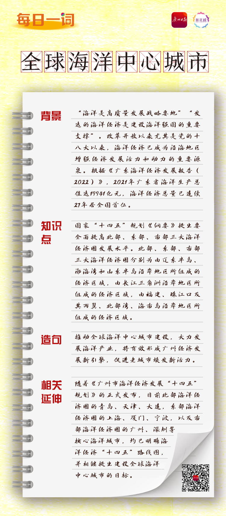 8月24日,《广州市海洋经济发展“十四五”规划》正式印发,提出到2035年,广州将建成海洋经济发达、海洋科技创新活跃、海洋城市文化特色彰显、海洋治理体系和治理能力现代化的全球海洋中心城市,将南沙区建设成为全球海洋中心城市核心区。