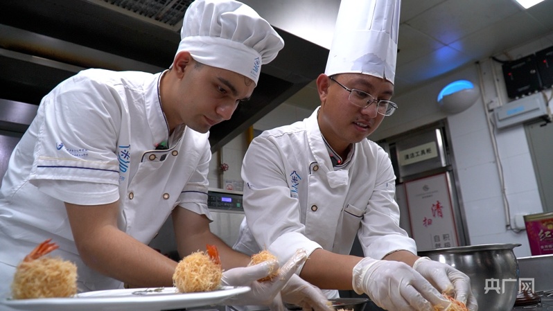 阿热跟着黎正开(右)学习制作粤菜(央广网记者官文清 摄)