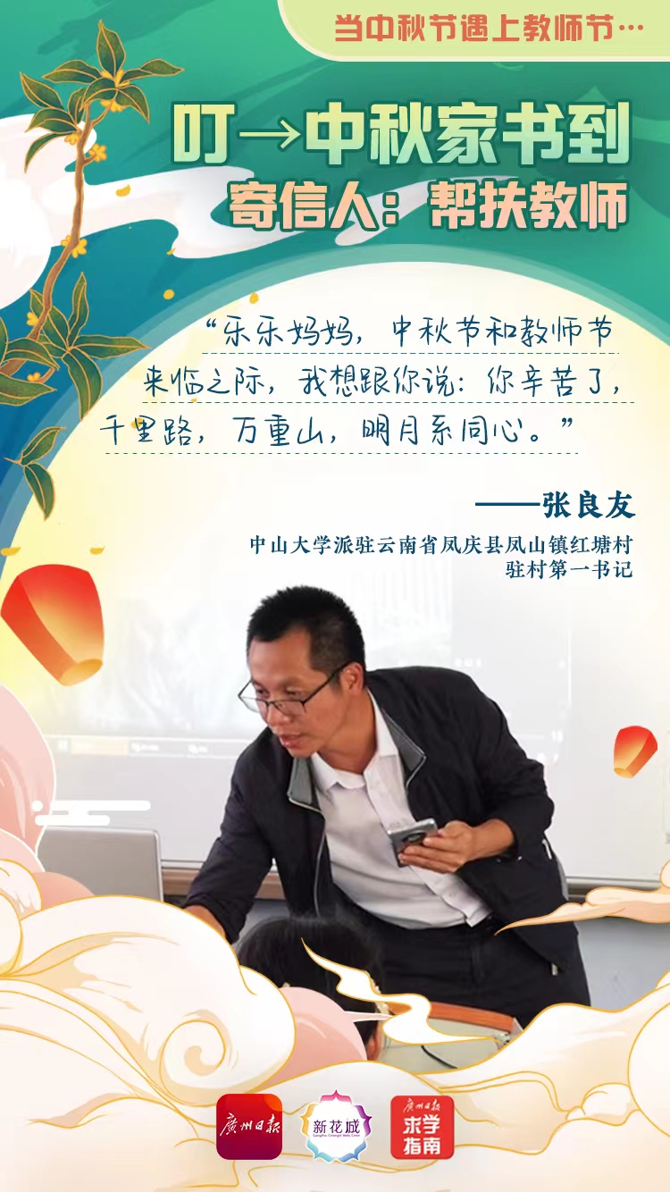 乐乐妈妈,在外驻村工作,我最感到愧疚的是对你了。儿子年龄小,咱们父母都年迈,你一人撑起家里。同为中山大学的职工,你工作繁忙之余撑起照顾老小的责任,最是不容易。家里很多琐碎事情或困难,你很少告诉我,都自己想办法解决,我知道你是想少让我操心,安心驻村工作。乐乐妈妈,中秋节和教师节来临之际,我想跟你说:你辛苦了,千里路,万重山,明月系同心。祝双节快乐!