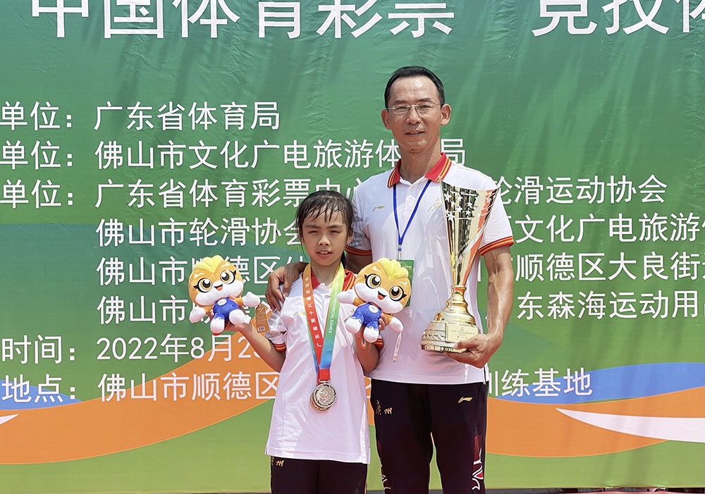 夺得10000米积分淘汰赛女子丙组第二名的张雅倩和广州市速度轮滑队主教练袁志强合影