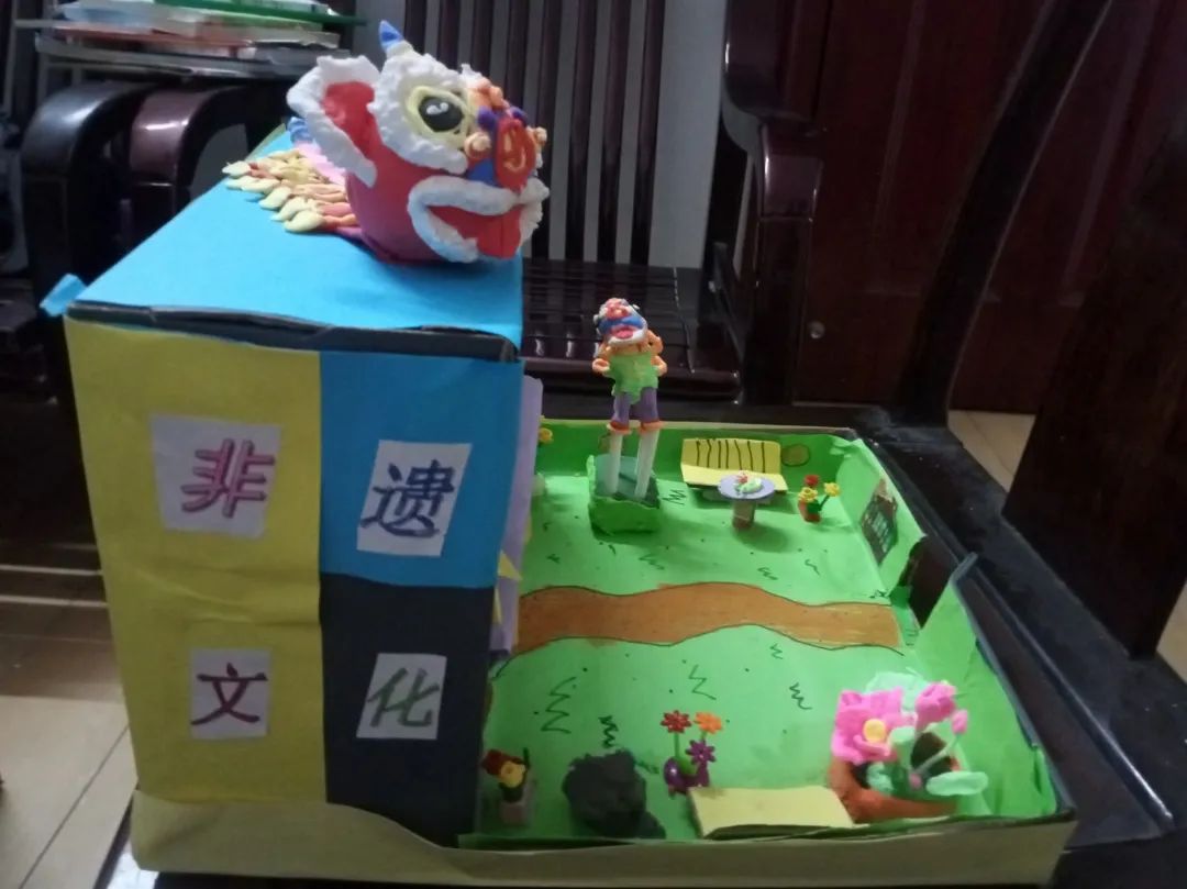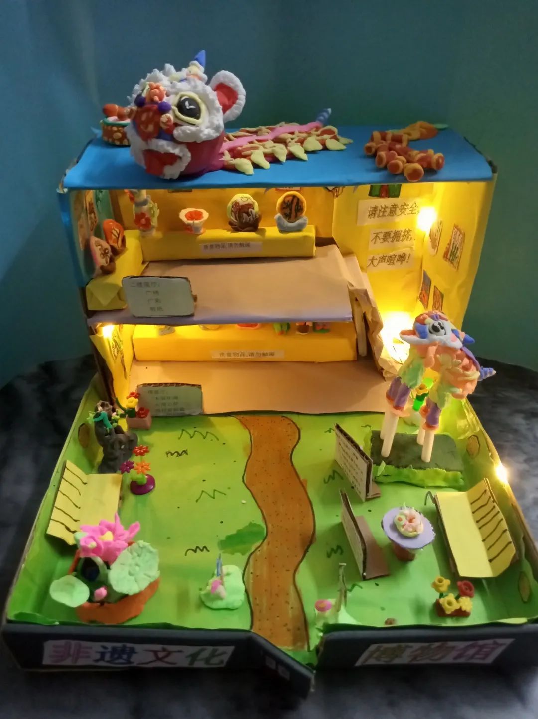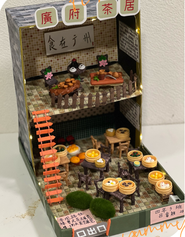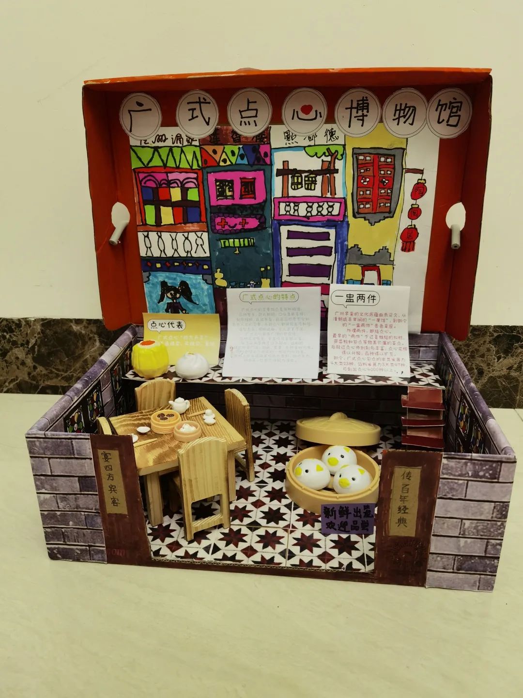 最后,当然少不了我们最熟悉的广府特色啦!孩子们将水乡风情、精美戏服、舞龙舞狮、珍馐美食等传统的广府文化,全部浓缩进了自己的“一尺三寸地”——