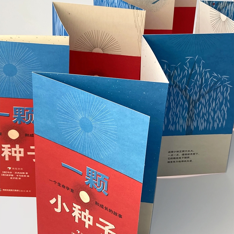 科普知识自然融入生命故事里,植物知识简单易懂,用故事语言讲述植物的生长,更易于学龄前儿童理解和接受。以独具匠心的设计呈现生命的力量、循环和生生不息。全书的一面以红色为主色调,红色代表大地,孕育小种子;另一面以蓝色为主色调,蓝色代表天空,为植物生长提供空间;采用风琴折页的装帧方式,从任何一页读起都能完整了解植物的生长过程,进而体会自然中生命的循环和生生不息;除了植物主角外,还设计了昆虫、老鼠、松鼠、喜鹊等动物形象,画面更加生动、有趣。