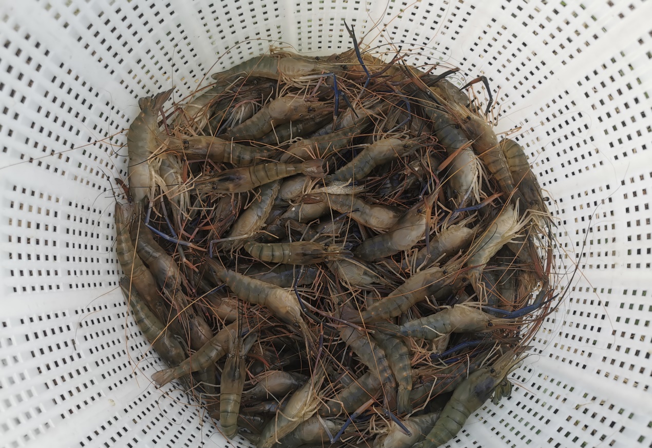 关则锋和公司的技术员撒网尝试着捕捞环沟里的虾,看看生长情况,大个的虾已有成年人的食指般大小,活蹦乱跳,虾身晶莹剔透。