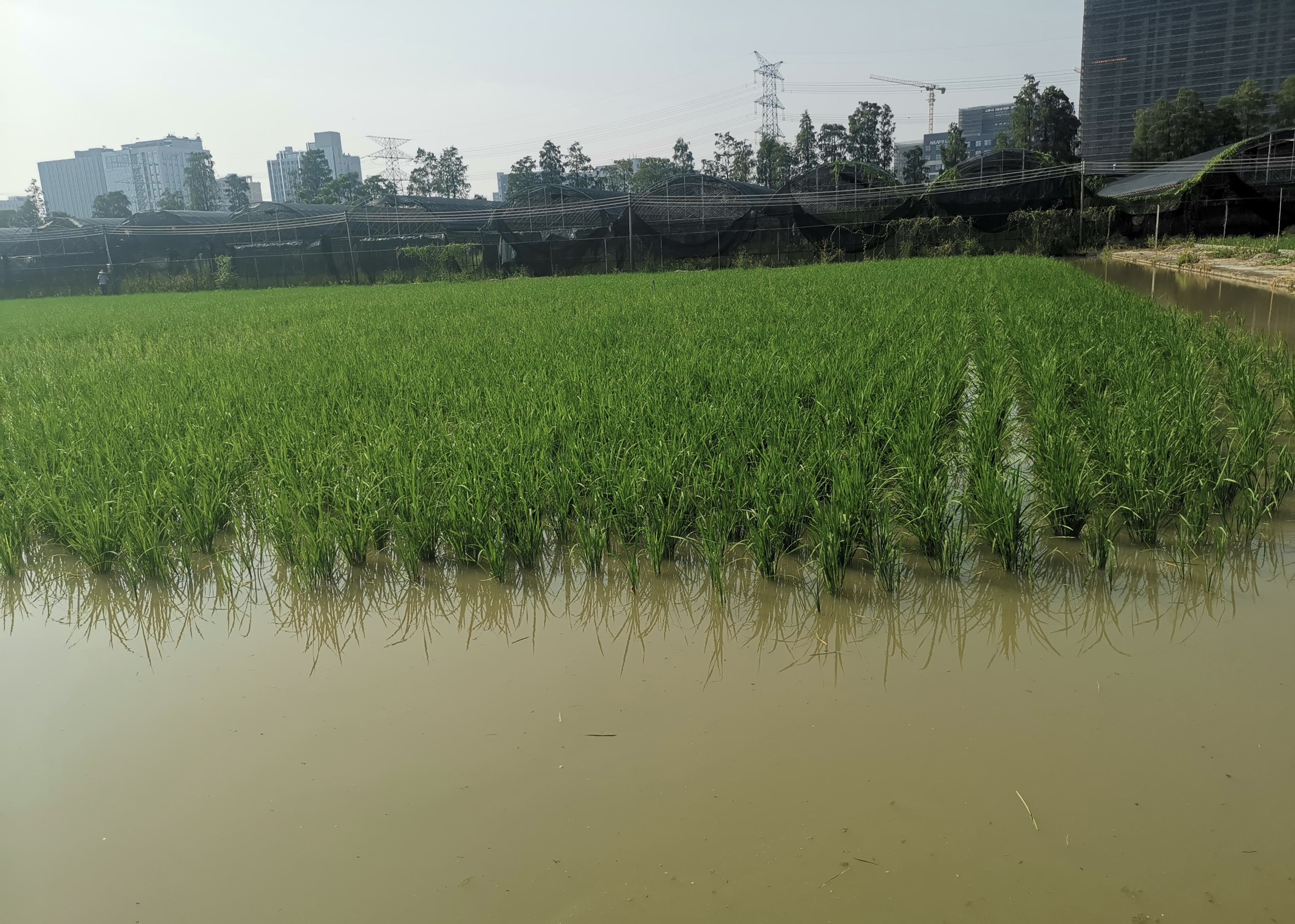 番禺区农科所的一处稻田,晚稻禾苗长得一片葱绿,稻田的四周开挖了宽2米、深1.5米左右的环沟,稻田和环沟里都灌满了水,环沟里面的增氧机在不停地运转。