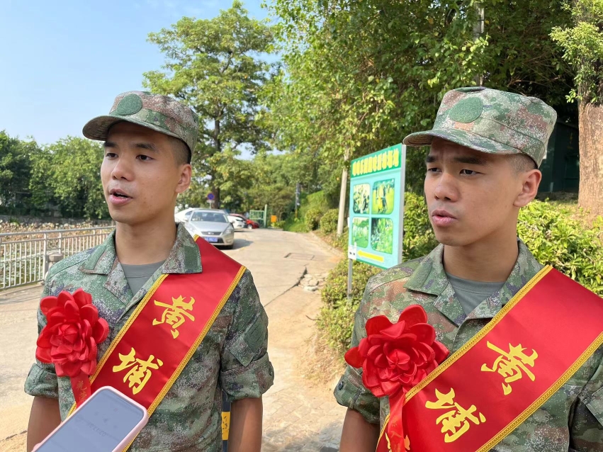 上午11时许,身披绶带、胸戴红花的孪生兄弟张艺达、张艺标和其他新兵一起,在广州南站搭乘高铁奔赴军营。