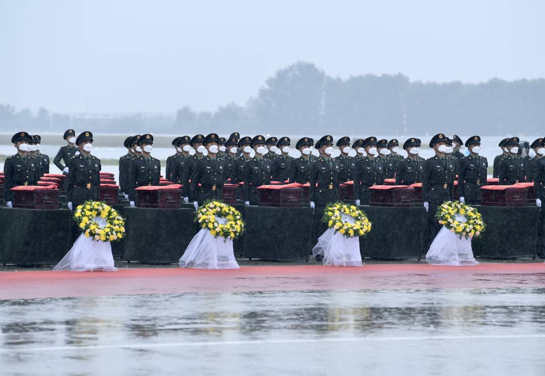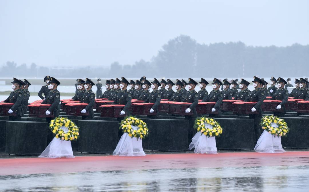 9月16日,沈阳桃仙国际机场,秋风瑟瑟,秋雨绵绵。礼兵战士将一具具烈士遗骸棺椁从机舱内抬出,每具棺椁上都覆盖着鲜艳的五星红旗。