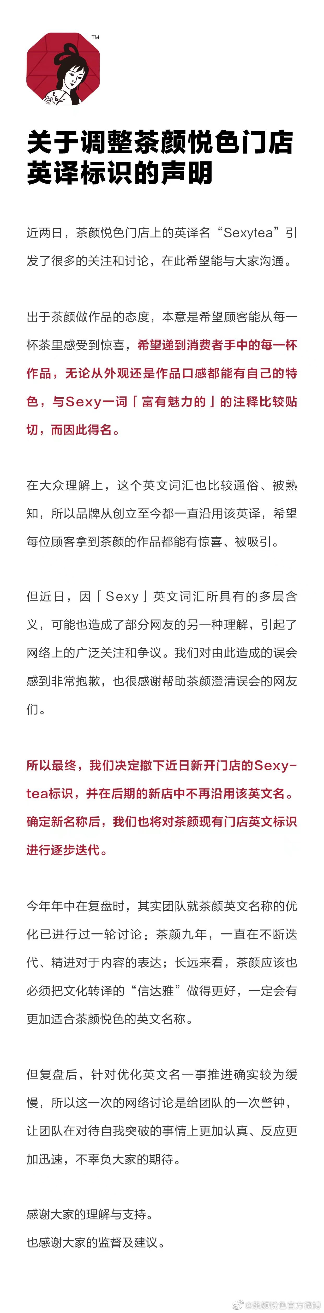茶颜悦色方面表示,决定撤下近日新开门店的SexyTea标识,并在后期的新店中不再沿用该英文名。确定新名称后,将对茶颜悦色现有门店英文标识进行逐步迭代。“团队就茶颜悦色英文名称的优化已进行过一轮讨论,长远来看,应该也必须把文化转译的‘信达雅’做得更好,一定会有更加适合茶颜悦色的英文名称。”