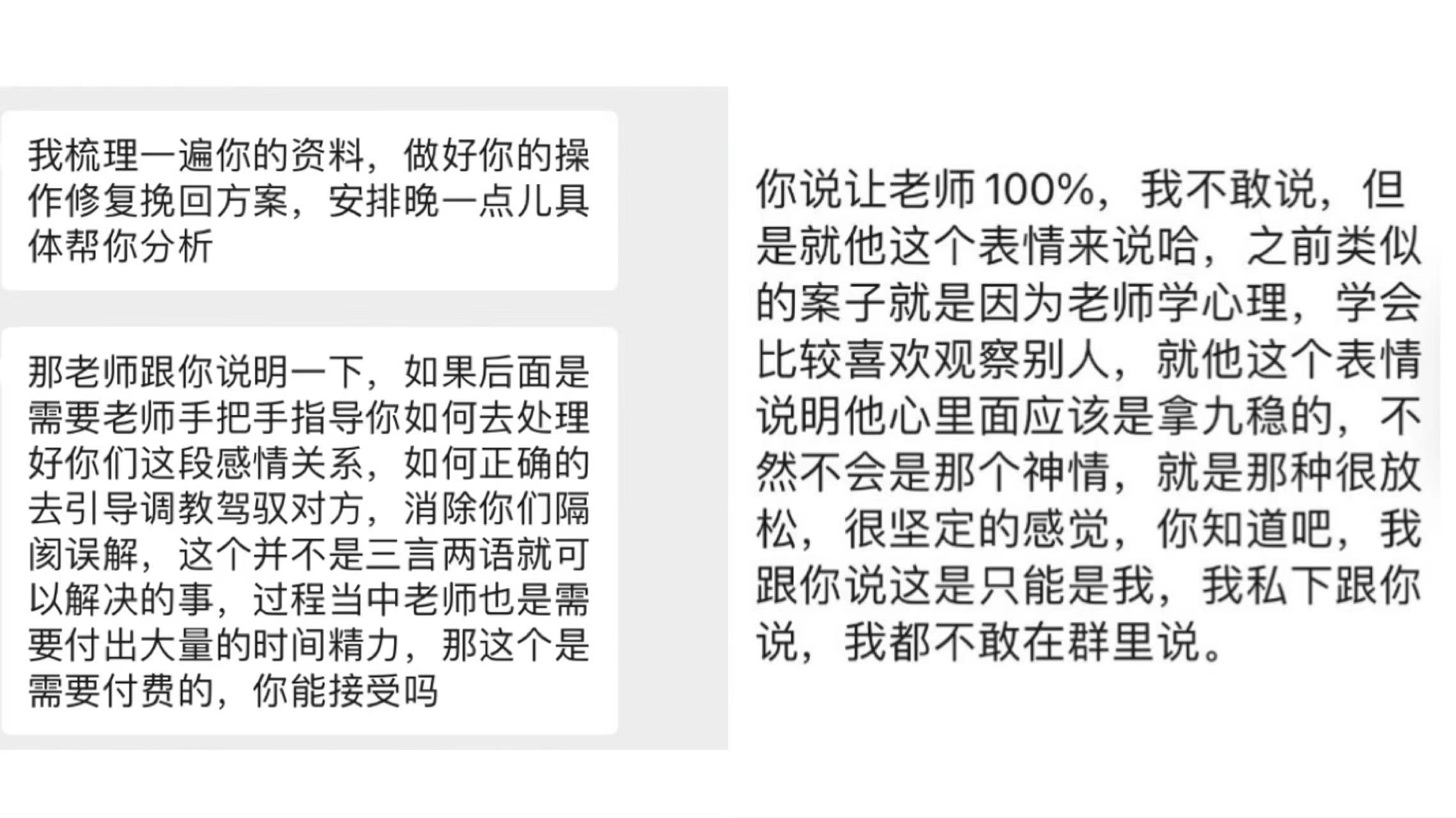 在记者的调查中,不少受访者表示在情感咨询机构的营销下和话术下,让他们坚定的觉得这段感情“有的救”,但在后续的合同与聊天记录中,对方并不会明确告诉他们“一定能挽回”“一定能有效果”,而是用“你这种情况很好处理”“我们见过比你复杂很多的案例”“相信我们肯定没问题”等话术给咨询方服下定心丸。