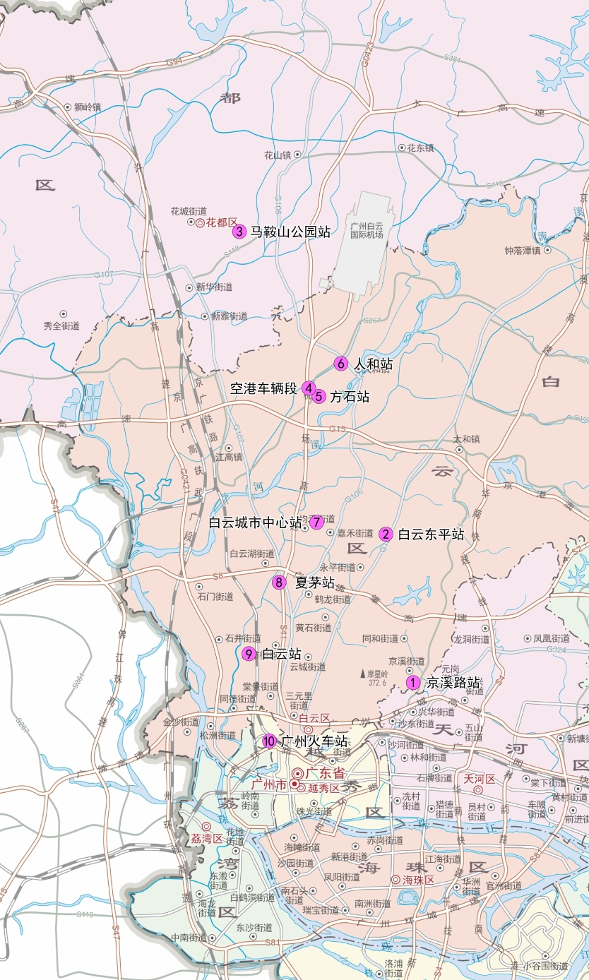 广州东至花都天贵城际(广花城际)自广州东站向北延伸至花城街站,线路长约39.6公里,新建7座车站,向南衔接广州地铁十八号线进入广州中心城区,向北串联白云城市中心、空港经济区、空铁联合发展示范区、花都中心区,与芳白城际跨线运营,连接白云机场,实现广州市中心与花都中心、白云机场等外围中心30分钟通达,满足花都中心、方石、白云城市中心与广州主城区的高速联系及高速通达白云机场的出行需求。