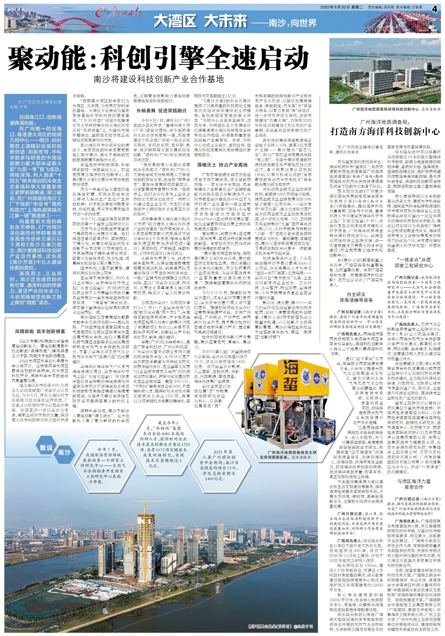 在广州唯一的出海口、粤港澳大湾区的地理几何中心——南沙,时时都在上演精彩纷呈的创新创造:剑指苍穹,中科宇航参与研发的中国目前推力最大固体运载火箭“力箭一号”首飞成功;探秘深海,列入国家“十四五”相关规划的冷泉生态系统科学大装置系统正紧锣密鼓推进;穿江破岩,在广州海瑞克南沙工厂下线的“申崇号”盾构机助力“上海轨道穿越长江第一隧”掘进施工……