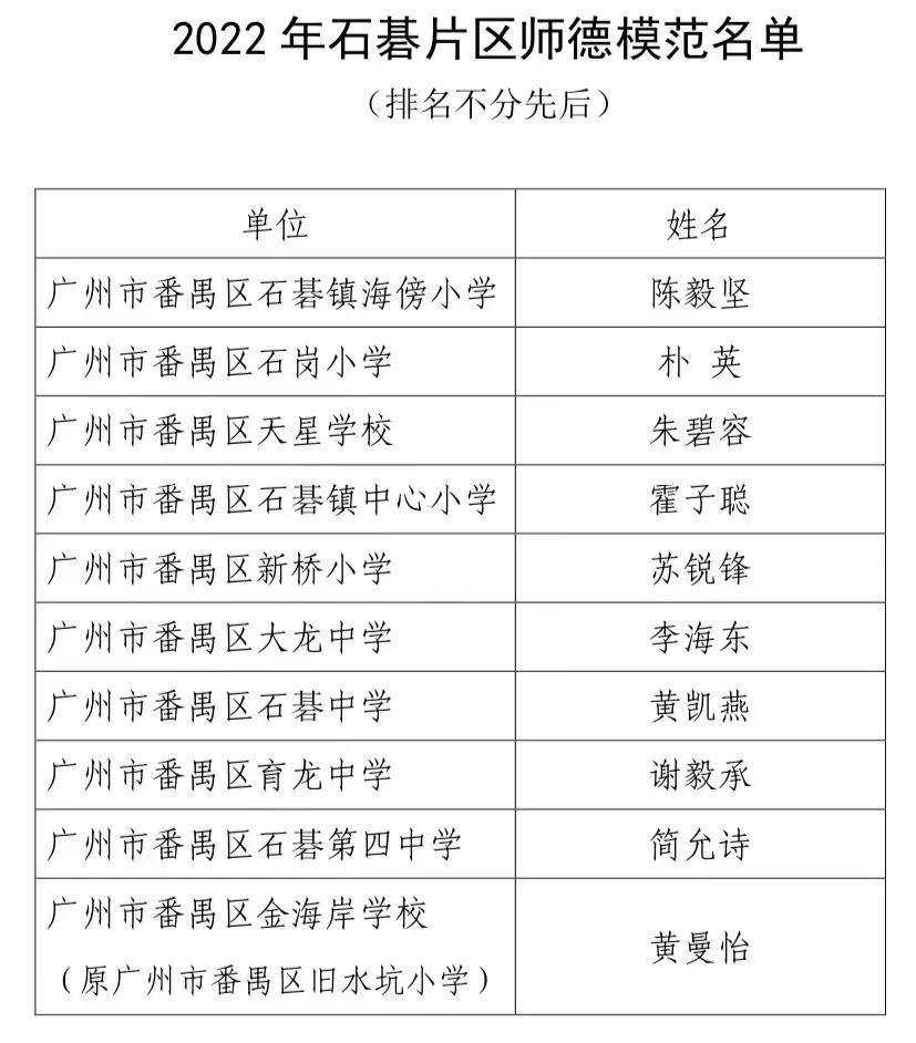 经个人自荐、石碁片区评审工作小组评议、石碁教育指导中心党委会议审定、候选人名单公示等环节,现正式确定10名同志为2022年石碁片区师德模范。