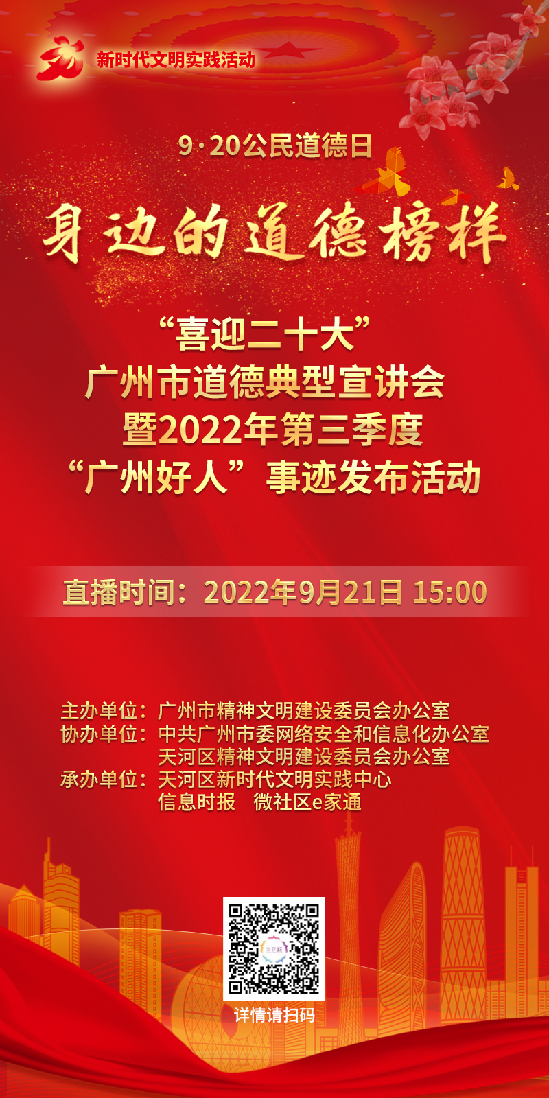 9月20日,时值公民道德日,身边的道德榜样——“喜迎二十大”广州市道德典型宣讲会暨2022年第三季度“广州好人”事迹发布活动,在天河区新时代文明实践中心拉开帷幕。此次活动由广州市精神文明建设委员会办公室主办,中共广州市委网络安全和信息化办公室、天河区精神文明建设委员会办公室协办,天河区新时代文明实践中心、信息时报、微社区e家通承办。