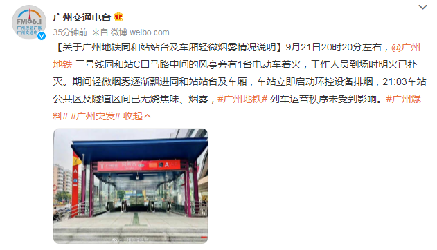 9月21日20时20分左右,地铁三号线同和站C口马路中间的风亭旁有1台电动车着火,工作人员到场时明火已扑灭。期间轻微烟雾逐渐飘进同和站站台及车厢,车站立即启动环控设备排烟,21:03车站公共区及隧道区间已无烧焦味、烟雾,列车运营秩序未受到影响。