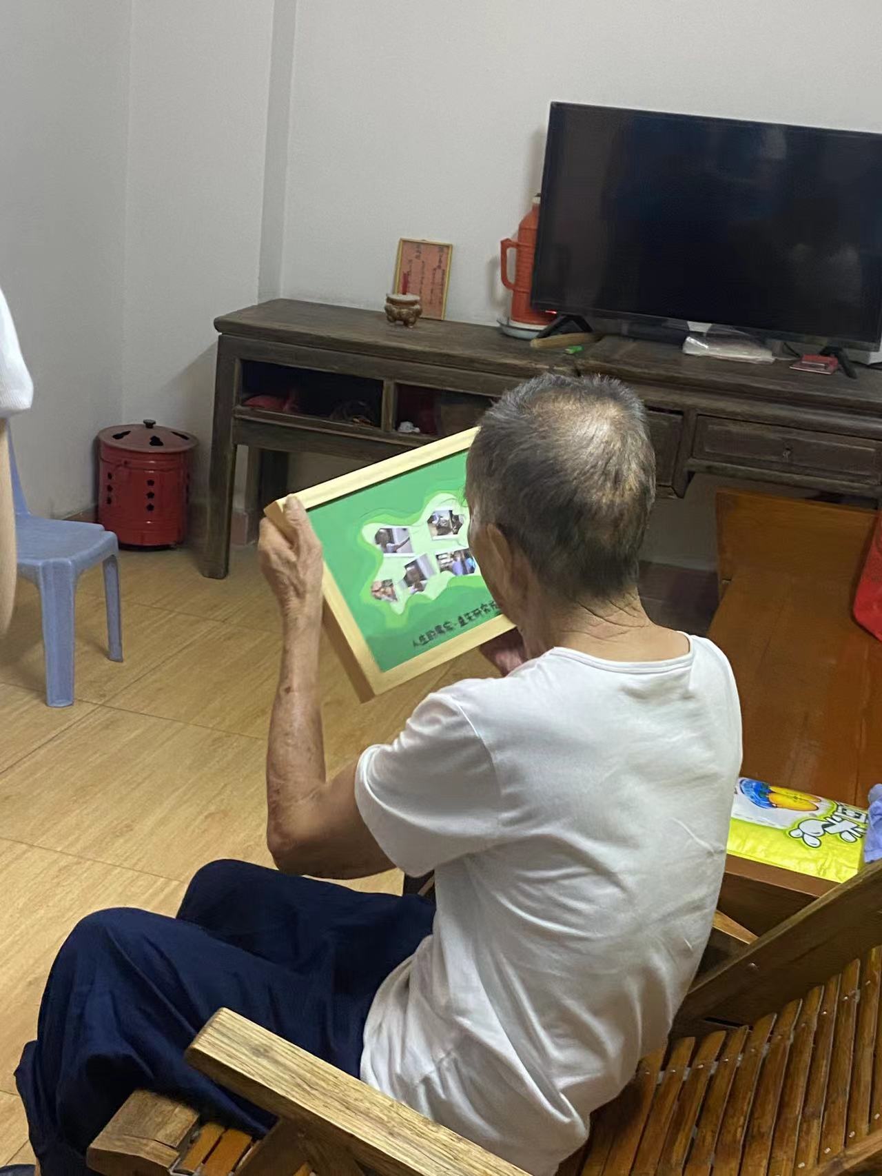 但褚叔没有伴侣,没有孩子,只有兄弟,过往的故事都只留在褚叔的记忆中,未曾有过一张照片。共照志愿者在服务期间为褚叔拍摄了近照,也拍摄了褚叔退休后的娱乐之处——村里的公园和村里的活动室,并用盎然的绿色为底,制作了褚叔的人生纪念物。收到纪念物的褚叔,爱不释手,久久地看着自己的照片,最后把纪念物放到电视机旁边,说是要每天都看着。
