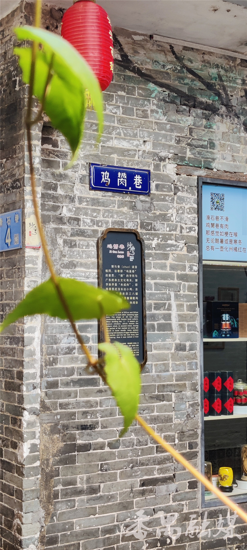 如今的鸡膥巷虽然已经没有当年卖蛋农妇的踪影,但依然有着当年沙湾的韵味。麻石铺成的道路、青砖砌成的墙壁,巷口挂着“鸡膥巷”的路牌以及介绍地名历史的木质牌子……鸡膥巷和沙湾所有的古巷一样,历史悠久,别具韵味。而那“鸡膥——,鸡膥——”的叫卖声,如今也只能停留在想象里,无处寻觅。这条小巷,承载了沙湾几代村民的集体记忆。如今,“鸡膥巷”俨然成为沙湾古镇的一条艺术小巷,这里聚集了不少极具岭南文化气息的小店,过往的游客也总是站在巷口驻足留影。