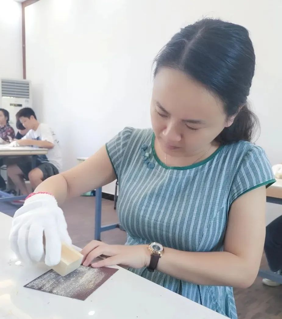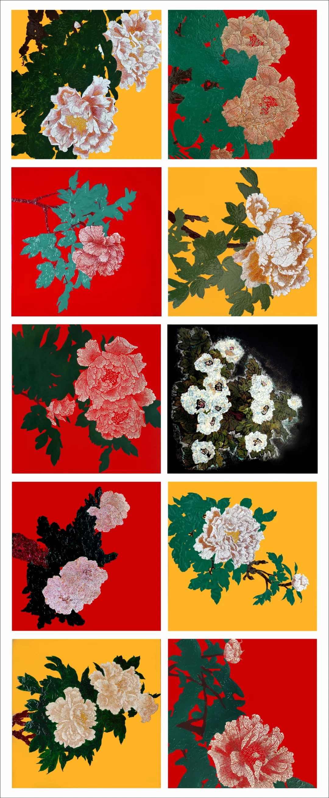 梁捷老师利用寒假期间,带着9名非专业学生利用线上辅导的方式创作漆画作品《芳菲满目斗娇妍》。作品由10张40X40厘米的漆画组成,画里的牡丹花形态各异。
