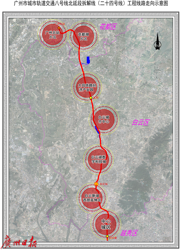 24号线从广州北站到纪念堂,预留往南延伸的条件。此前招标显示,24号线设计时速也是100公里。线路在纪念堂站与13号线垂直相交,两条线路形成“十字”交汇。当前,24号线已启动社会稳定风险分析公众意见征询公示,正纳入广州市城市轨道交通第三期建设规划调整,向国家申报。