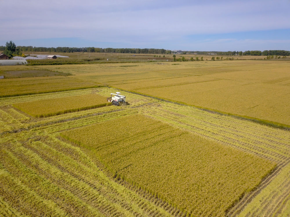 9月20日,在吉林省长春市九台区龙嘉农乐种植家庭农场,农民驾驶农机收割水稻(无人机照片)。新华社记者张楠摄