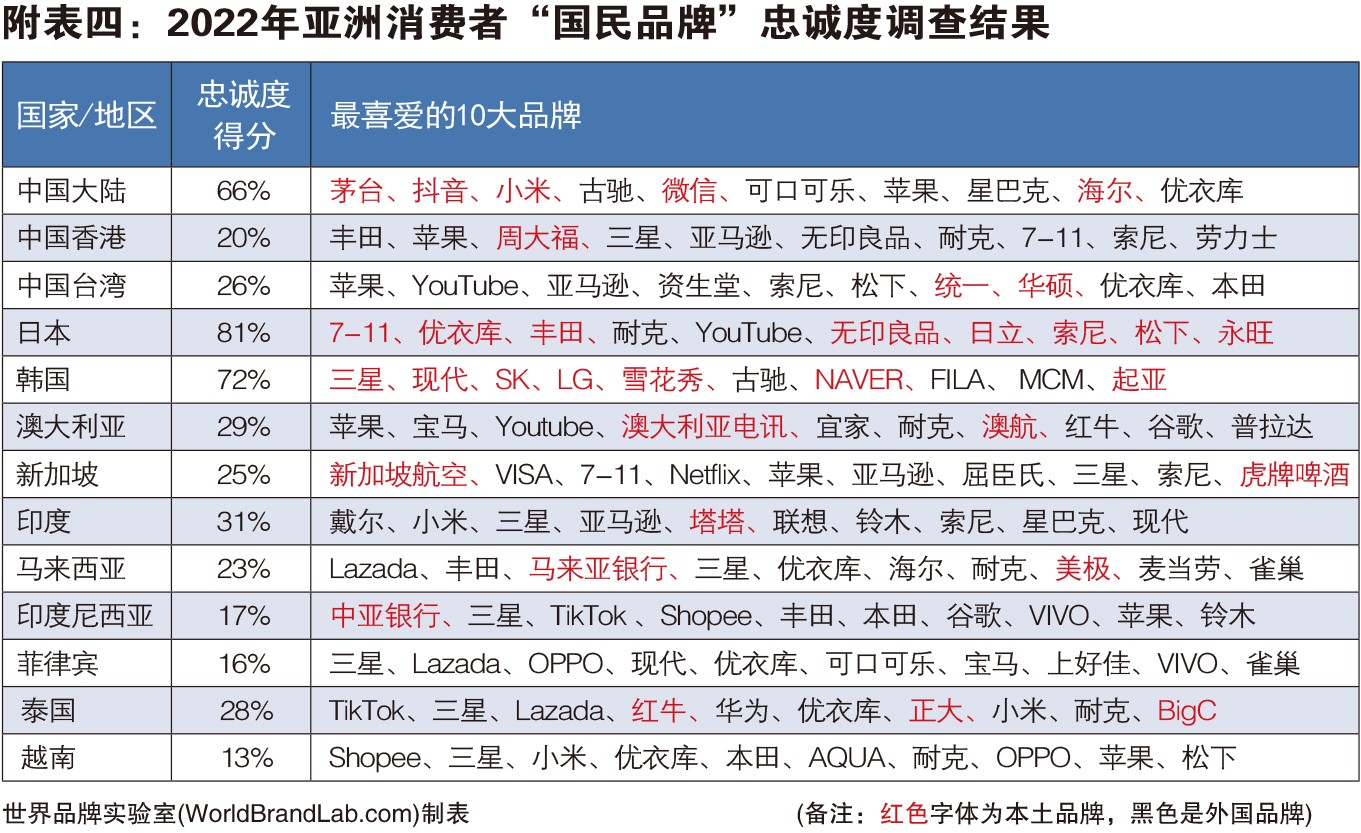 对亚洲市场内部而言,各国国民的消费忠诚度相去甚远。日本消费者的国民品牌忠诚度依然最高,高达81%;韩国排名第二,忠诚度达72%;中国大陆消费者对本土品牌的热度持续走高,达到66%,排名第三。