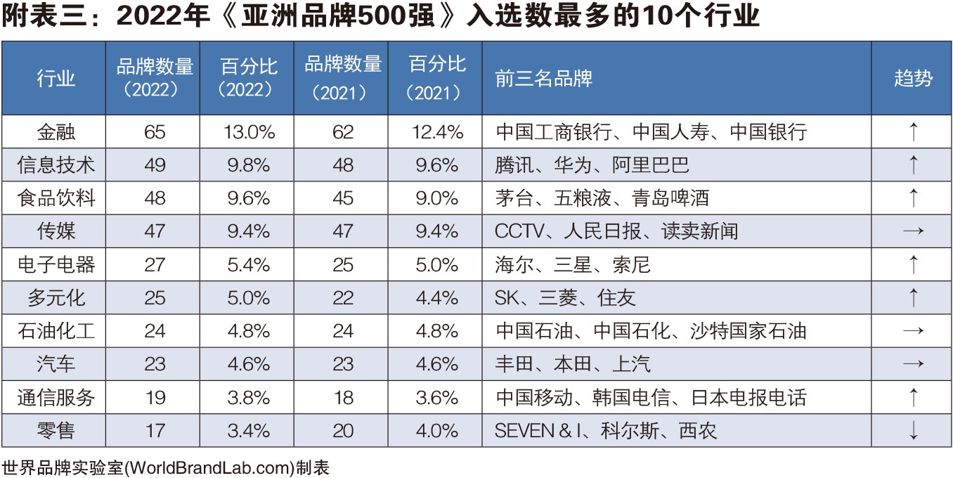 面对新冠疫情造成的经济动荡,各行各业都受到不同程度的冲击。与去年相比,金融、信息技术、食品饮料等行业入选数量有所上升,而零售、房地产、航空服务等行业数量均出现下滑。本年度《亚洲品牌500强》排行榜中,共有来自金融、传媒、信息技术、食品饮料、电子电器等在内的41个行业的品牌入选。金融是入选品牌最多的行业,共有65个品牌入选。位居第二到第五的行业分别是信息技术(49个)、食品饮料(48个)、传媒(47个)、电子电器(27个)。其中表现出色的中国品牌有国家电网、海尔、五粮液、中国南方电网、北大荒、青岛啤酒、通威、恒力、盛虹、国贸控股、飞鹤、九牧、双星轮胎、协鑫等。世界品牌实验室分析认为,与美国相比,亚洲各国的科技品牌相对较弱。