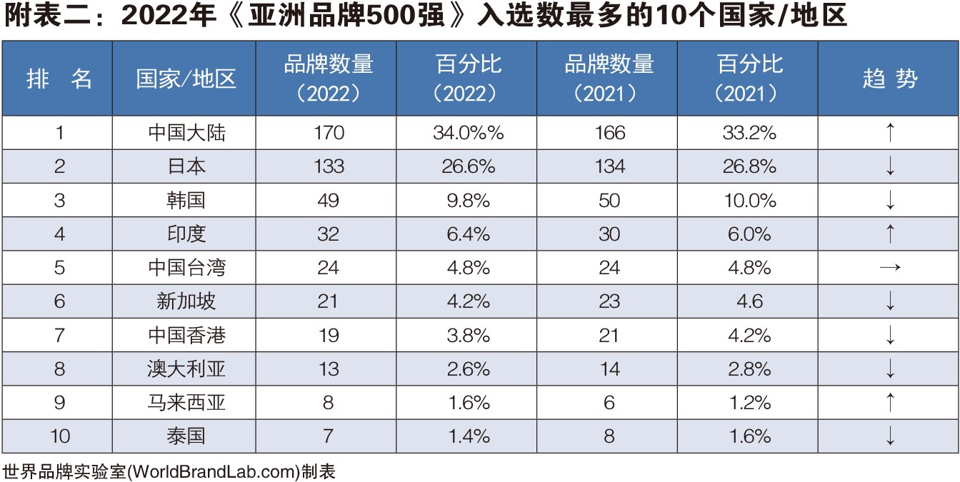 《亚洲品牌500强》的评判标准是品牌的亚洲影响力。世界品牌实验室学术委员会主席、牛津大学教授斯蒂芬·沃格(Steve Woolgar)分析,评价亚洲品牌影响力的基本指标包括市场占有率(Market Share)、品牌忠诚度(Brand Loyalty)和亚洲领导力(Asian Leadership)。此次亚洲品牌500强共有20个国家和地区的品牌入选,中国(包含港澳台)入选的品牌共计214个,占整个亚洲品牌500强的42.8%,位居第一,其中中国大陆入榜品牌有170个;日本有133个品牌入选,位居第二;位居第三的是韩国,入选49个品牌。沃格教授认为,亚洲拥有40多亿人口,占世界人口的60%,仍然是世界上最具潜力的经济体。因此,在亚洲建立品牌是一个极具潜力的市场。