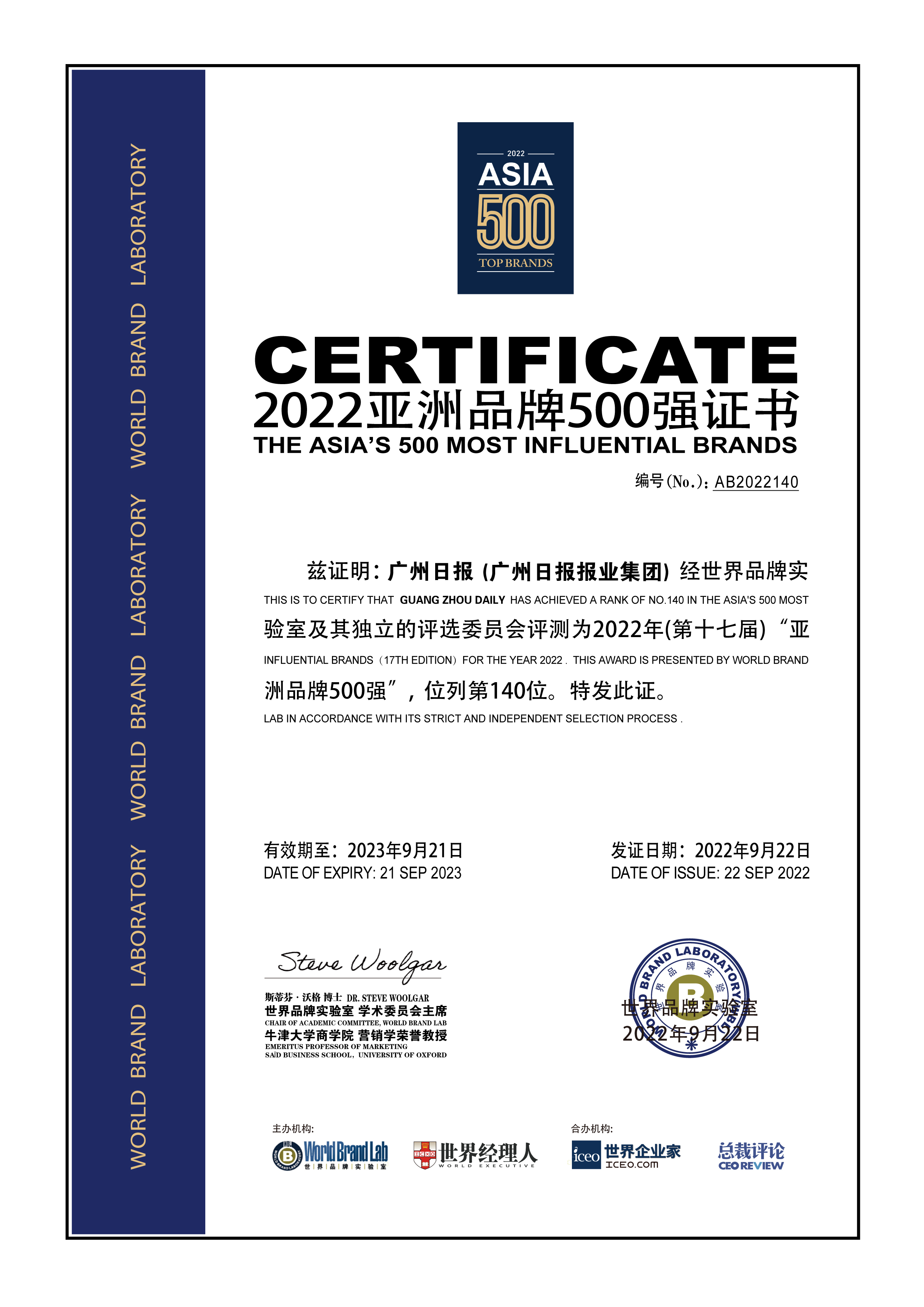 由世界品牌实验室(World Brand Lab)主办的“亚洲品牌大会”于9月22日在上海召开。会上发布了2022年《亚洲品牌500强》排行榜。这是世界品牌实验室第十七次对亚洲品牌的影响力进行的测评, 共有20个国家和地区的500个品牌入选。《广州日报》位列亚洲报业十大品牌第9,总榜排名140位。在今年7月发布的2022年(第十九届)“中国500最具价值品牌”排行榜。榜单显示,今年《广州日报》品牌价值再创新高,跃升至665.57亿元。