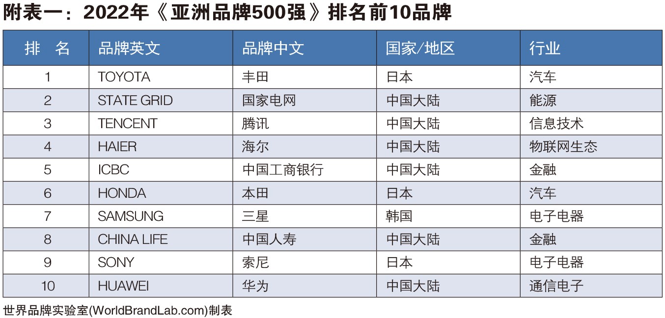 榜单显示,丰田、国家电网、腾讯名列前三,占据榜单前十名的还有海尔、中国工商银行、本田、三星、中国人寿、索尼和华为。中国、日本和韩国是入选品牌最多的三个国家。