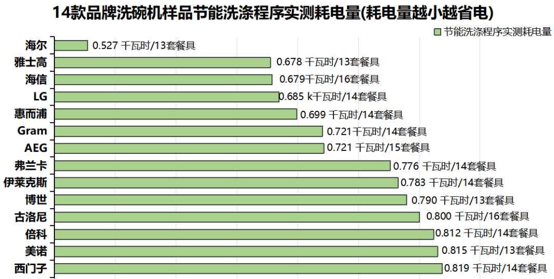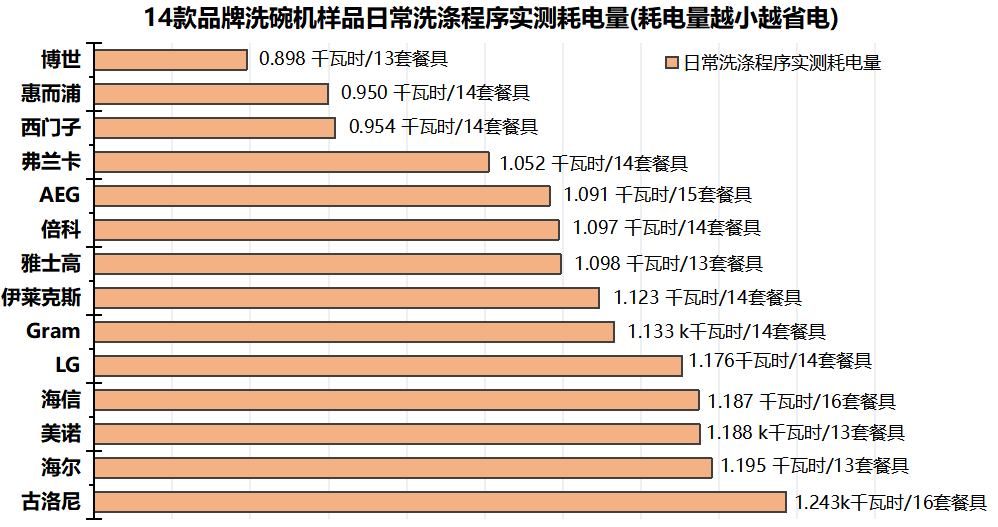 在对14款样品的产品性能、产品能耗和产品使用便捷性等方面进行测评过程中发现,大多数洗碗机的日常洗涤程序比节能洗涤程序洗涤性能表现更好。基于此,在测试的14款洗碗机样品中,日常洗涤程序下平均耗电量约1.1度,跟一台1.5匹空调运行一小时的耗电量(约1.2度)相差不大。日常洗涤程序下耗水量为10.2-18.3升,这相较于日常家庭生活中流动水清洗餐具更为省水。