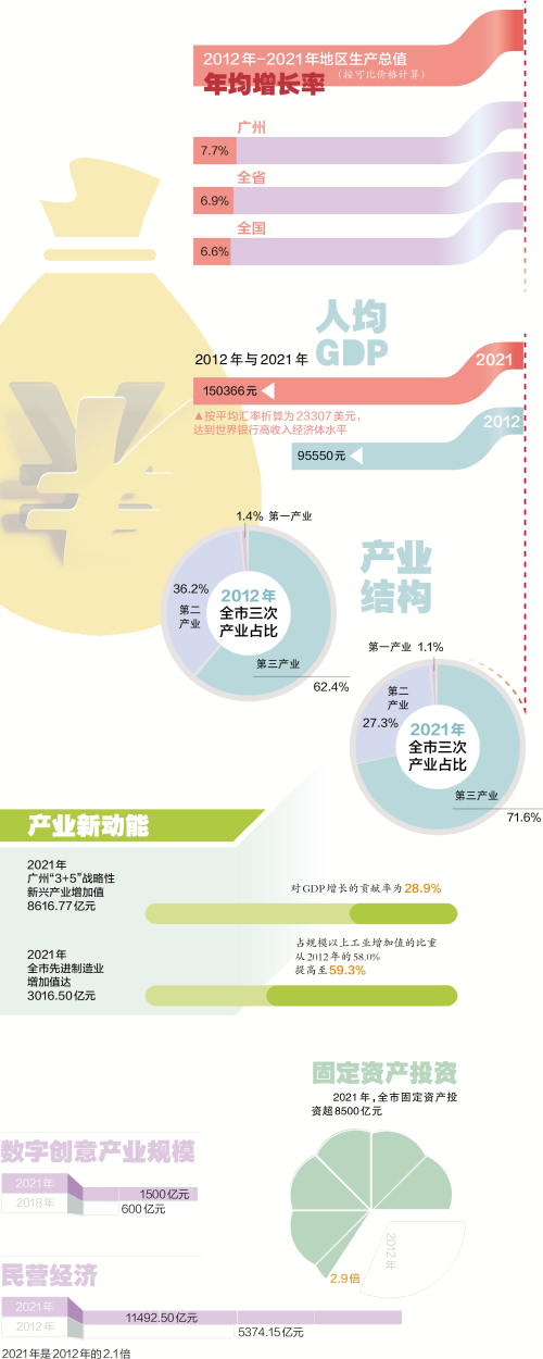 随着我国经济发展进入新常态,广州积极转变发展方式,经济由高速增长阶段转向高质量发展阶段,按可比价格计算,2012年-2021年广州地区生产总值年均增长7.7%,增速高于全国(6.6%)、全省(6.9%)。人均GDP突破2万美元。按常住人口计算,广州人均GDP从2012年的95550元提升至2021年的150366元;按现价计算,2021年是2012年的1.5倍;按平均汇率折算为23307美元,达到世界银行高收入经济体水平。产业结构调整优化。2012年,全市三次产业占比为1.4:36.2:62.4,第三产业持续较快增长,第三产业占GDP比重继续提升,成为推动广州经济增长的重要力量,2019年超70%,2021年提高到71.6%,全市三次产业结构调整为1.1:27.3:71.6。随着“制造业立市”的提出,产业结构及时调整,第二产业地位加固。第二产业占比在2017年低于30%,随后波动回升,2021年回升至27.3%,2022年上半年回升至28.0%;其中工业占GDP比重从2020年的23.3%回升至2021年的23.8%,2022年上半年回升至24.8%。