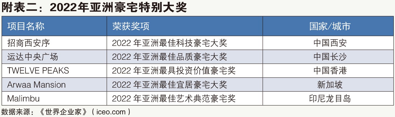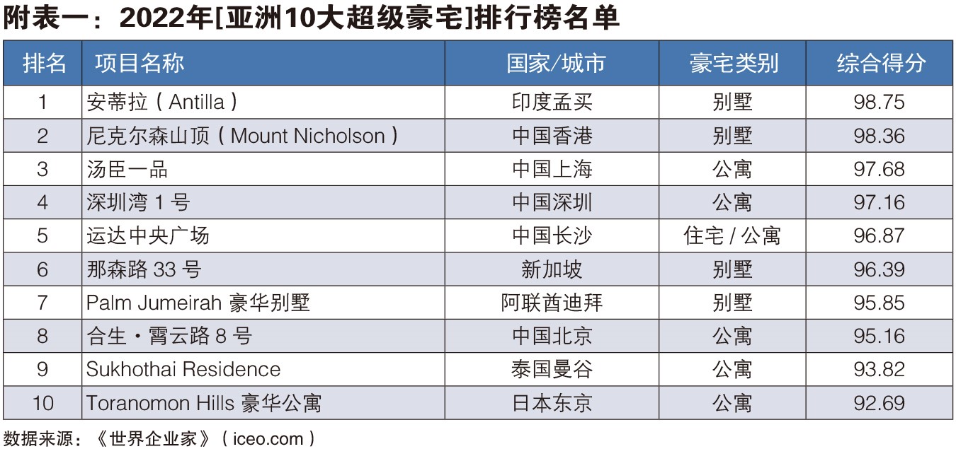 由世界企业家集团、世界地产研究院联合编制并发布的2022年(第十三届)“亚洲10大超级豪宅”排行榜于2022年9月22日在上海揭晓。印度的安蒂拉位居第一,香港的尼克尔森山顶排名第二、上海的汤臣一品排名第三。中国其他入选的豪宅项目还有深圳的深圳湾1号(第四名)、长沙的运达中央广场 (第五名)、北京的合生·霄云路8号 (第八名)。据悉,亚洲豪宅调研报告全文刊发在《世界企业家》,这是世界企业家集团旗下的管理类杂志。