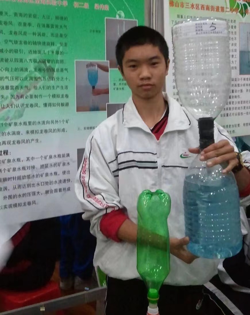 坐言起行,梁伟棠动手制作了“模拟龙卷风”教具,恰逢南海区举行“詹天佑杯”青少年科技创新大赛,这个教具勇夺发明创造及工程设计初中组一等奖。陈海锋表示:“这次比赛对伟棠的触动很大,让他懂得了‘科学探究,是需要动手去实践和积累的’。”