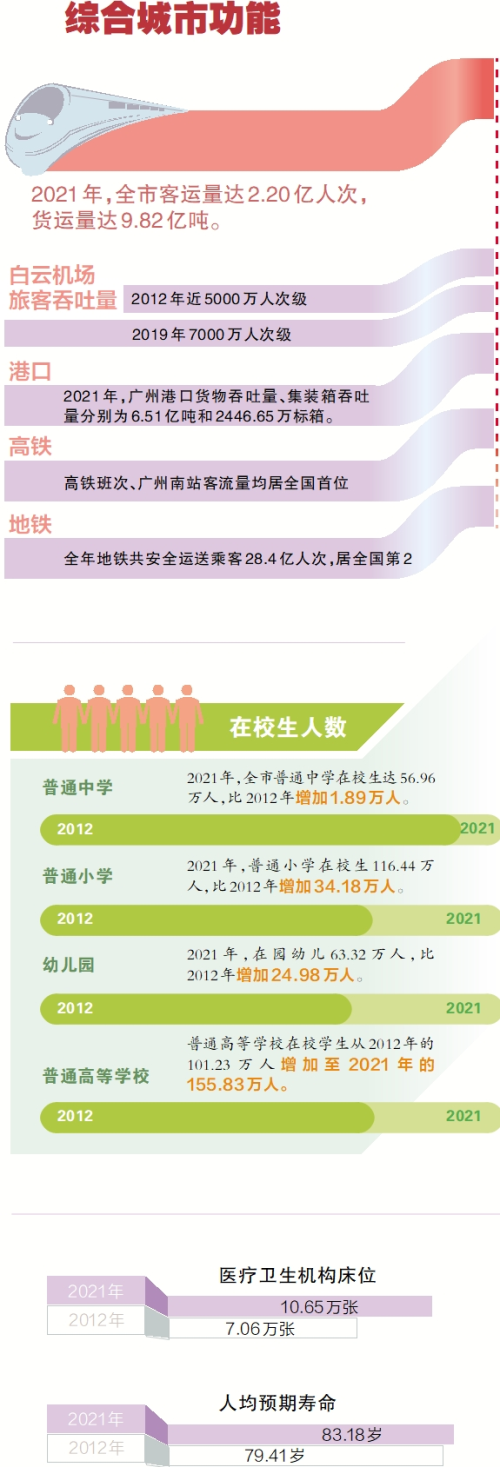 广州着力加强民生工作。2021年,全市普通中学在校生达56.96万人,比2012年增加1.89万人;普通小学在校生116.44万人,增加34.18万人;在园幼儿63.32万人,增加24.98万人。全市公办幼儿园、普惠性幼儿园在园幼儿占比提高到53.43%和88.18%。平均每名小学、普通中学教师负担学生数分别为17.92人、12.08人,均比2012年有所降低。高等教育为高质量发展提供人才支撑。普通高等学校在校学生从2012年的100万左右(101.23万人)增加至2021年的155万人(155.83万人)以上,在校大学生数量多年来居全国主要城市之首。普通高等学校研究生毕业生从2.03万人增加至3.38万人;本专科毕业生从23.69万人增加至31.98万人,为广州发展提供大量优质人才。加强与国外和港澳地区交流合作,打造粤港澳大湾区国际教育高地,至2022年华南理工大学广州国际校区和香港科技大学(广州)先后顺利开学。医疗资源与水平持续提升。2021年末,全市各类医疗卫生机构5814个,比2012年增长65.6%;三级医院达70家,其中三甲医院增至39家,数量位居全省第一,十年增加13家。全市医疗卫生机构床位从2012年的7.06万张增至2021年的10.65万张。人均预期寿命从2012年的79.41岁提高至2021年的83.18岁。全市养老床位从2012年的3.40万张提高至2021年的6.99万张。2021年,企业退休人员月均养老金达3834元,比2012年(2614元)增加1220元。