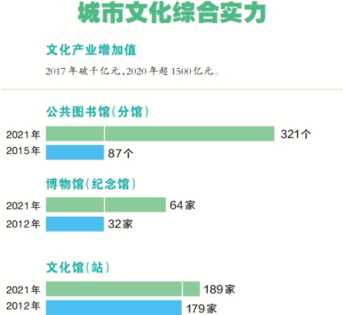 2021年,全市实现通借通还且面向所有公众免费开放的公共图书馆(分馆)321个,比2015年(87个)增加234个;每5.9万人拥有一座图书馆,镇(街)图书馆覆盖率达100%。2021年,博物馆(纪念馆)64家,比2012年(32家)增加1倍;文化馆(站)189家,比2012年(179家)增加10家。