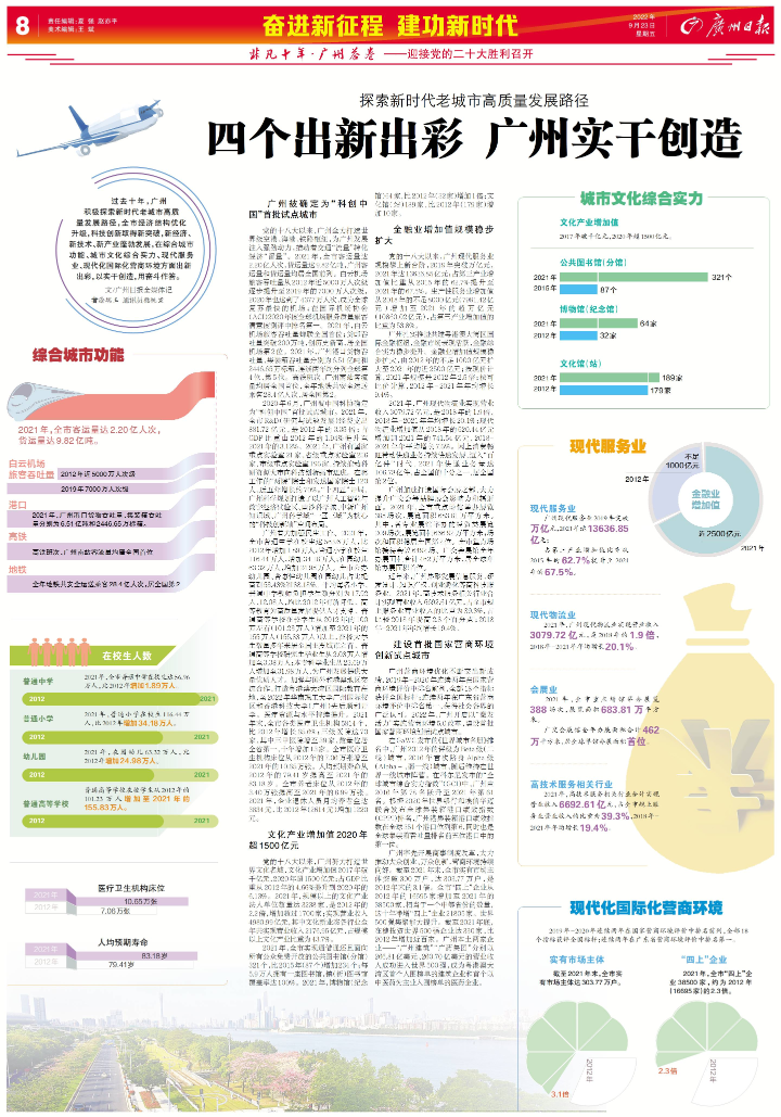 过去十年,广州积极探索新时代老城市高质量发展路径,全市经济结构优化升级,科技创新取得新突破,新经济、新技术、新产业蓬勃发展,在综合城市功能、城市文化综合实力、现代服务业、现代化国际化营商环境方面出新出彩,以实干创造,用奋斗作答。