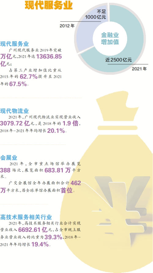 党的十八大以来,广州现代服务业规模攀上新台阶,2019年突破万亿元,2021年达13636.85亿元;占第三产业增加值比重从2015年的62.7%提升至2021年的67.5%。生产性服务业增加值从2018年的不足8000亿元(7981.42亿元)增加至2021年的超万亿元(10860.02亿元),占第三产业增加值的比重为53.8%。