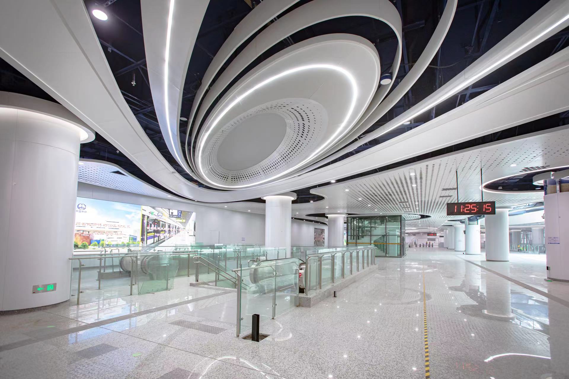 记者现场发现,岗厦北枢纽内核心换乘区的中心景观,是以“深圳之眼”为主题,引入飞马螺旋线双向延伸,体现了深圳“汇聚、包容、国际化”文化特征。其中,天眼中庭的设计采用了48X51.2米地下超大跨度组合结构,与彩田立交桥合建,结构复杂,设计建设难度极大,该结构跨度之大在国内外明挖地下结构中也尚属首次。