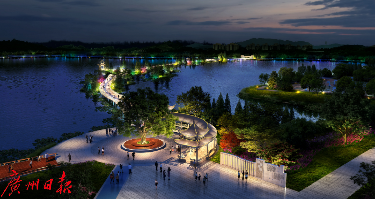 增城荔湖公园蜿蜒曲折的环湖碧道与湖光山色交相辉映。