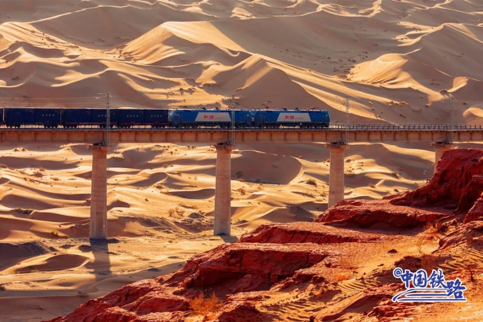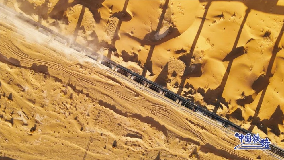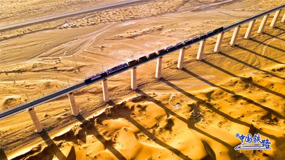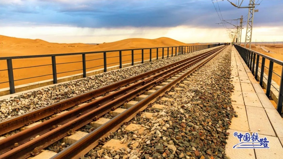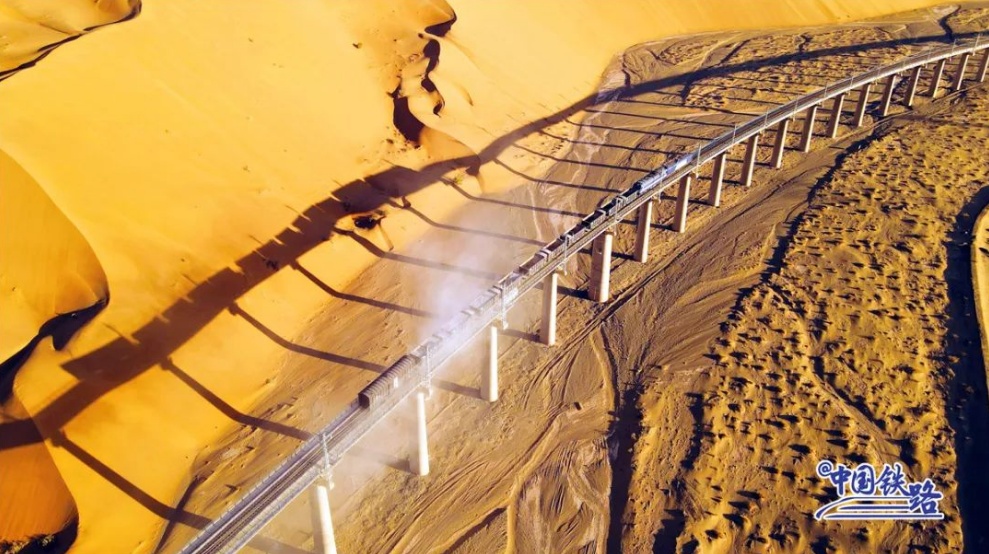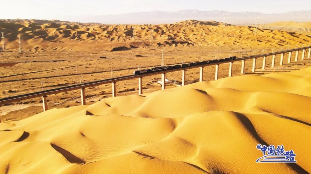 线路穿越沙漠时,铁路建设者巧妙利用支梁桥来避免风沙对铁路的侵害。全长10.6公里、最高处达30米,由320多个桥墩架设而成的沙山沟特大桥,完美地将工程景观和结构功能结合起来,这也是我国唯一一座穿越活动性沙漠的特长桥梁。