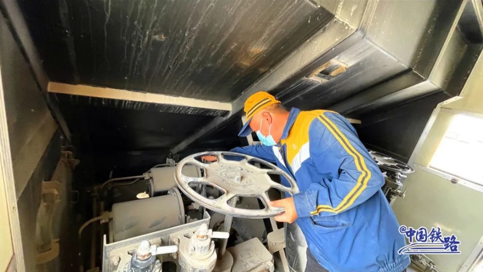 与普通货运列车不同,风动卸砟车的每节车辆除了装载道砟,还有一个操作间,配备一名工作人员操控阀门操作杆,根据卸砟进度掌握时机打开卸砟底门。