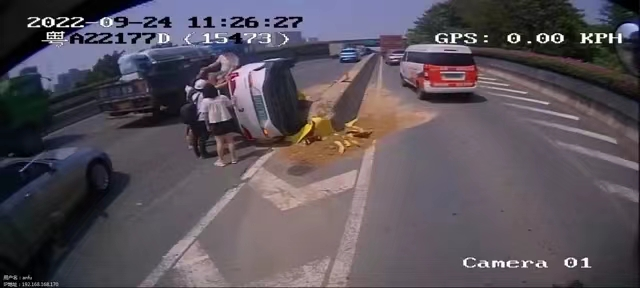 2022年9月24日中午,一辆小汽车侧翻在广园快速路丰乐路桥路段,路过的广州巴士集团二分公司214线公交车长徐汉基与路人携手,前后不到三分钟,将被困司机成功救出。