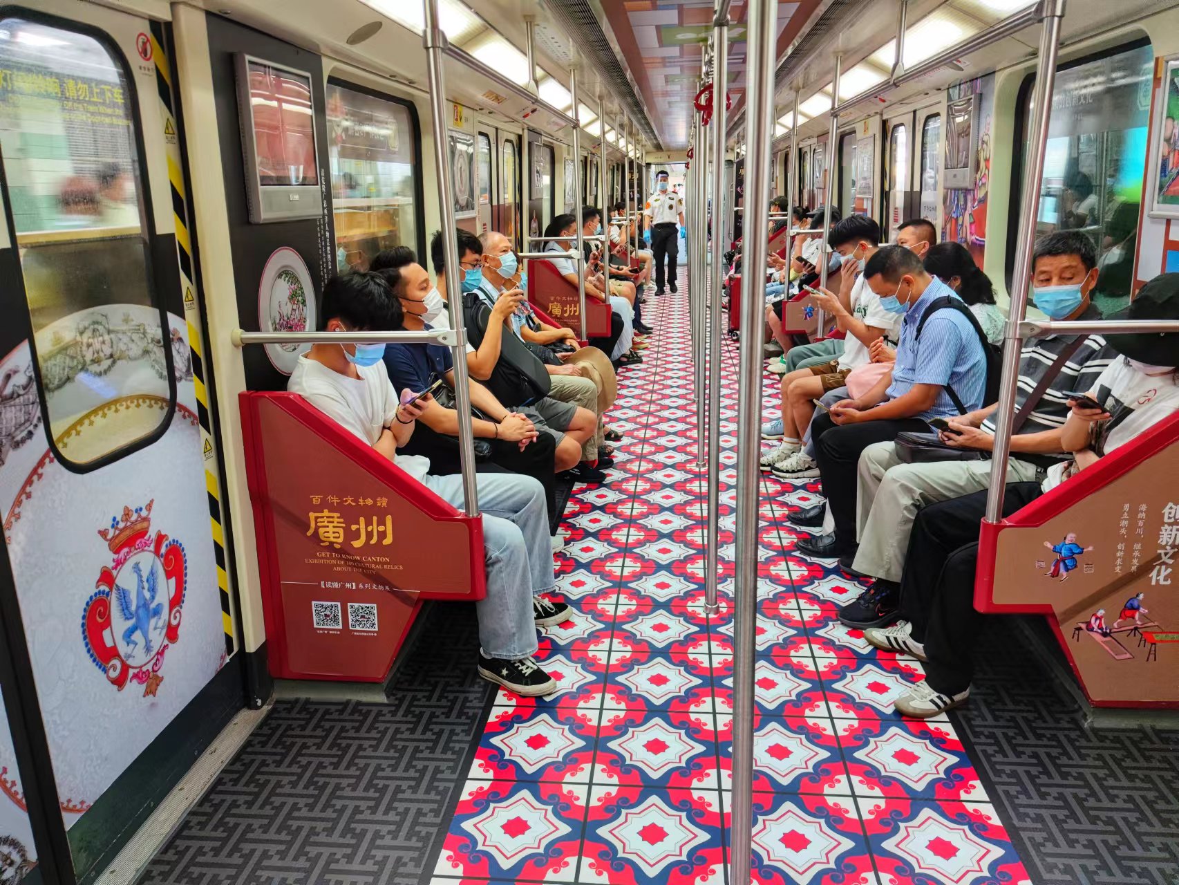 平时看惯了的车厢内饰今天全部“焕新”,而且每节车厢都不一样:一件件承载着广州历史荣光的文物图片在车体两侧渐次排开,旁边的说明文字无声地陈述着文物背后的故事;各节车厢的地板变成了不同的花色,有满洲窗、有花阶砖……第一节车厢里,“百件文物读广州”的大字和镇海楼的大幅图片赫然入眼;车尾,一连串的互动式题目让人忍不住去挑战。