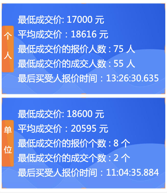 单位竞价方面,9月单位平均成交价为20595元,2个单位以最低成交价18600元成交。8月单位平均成交价为20372元,1个单位以最低成交价16900元成交。