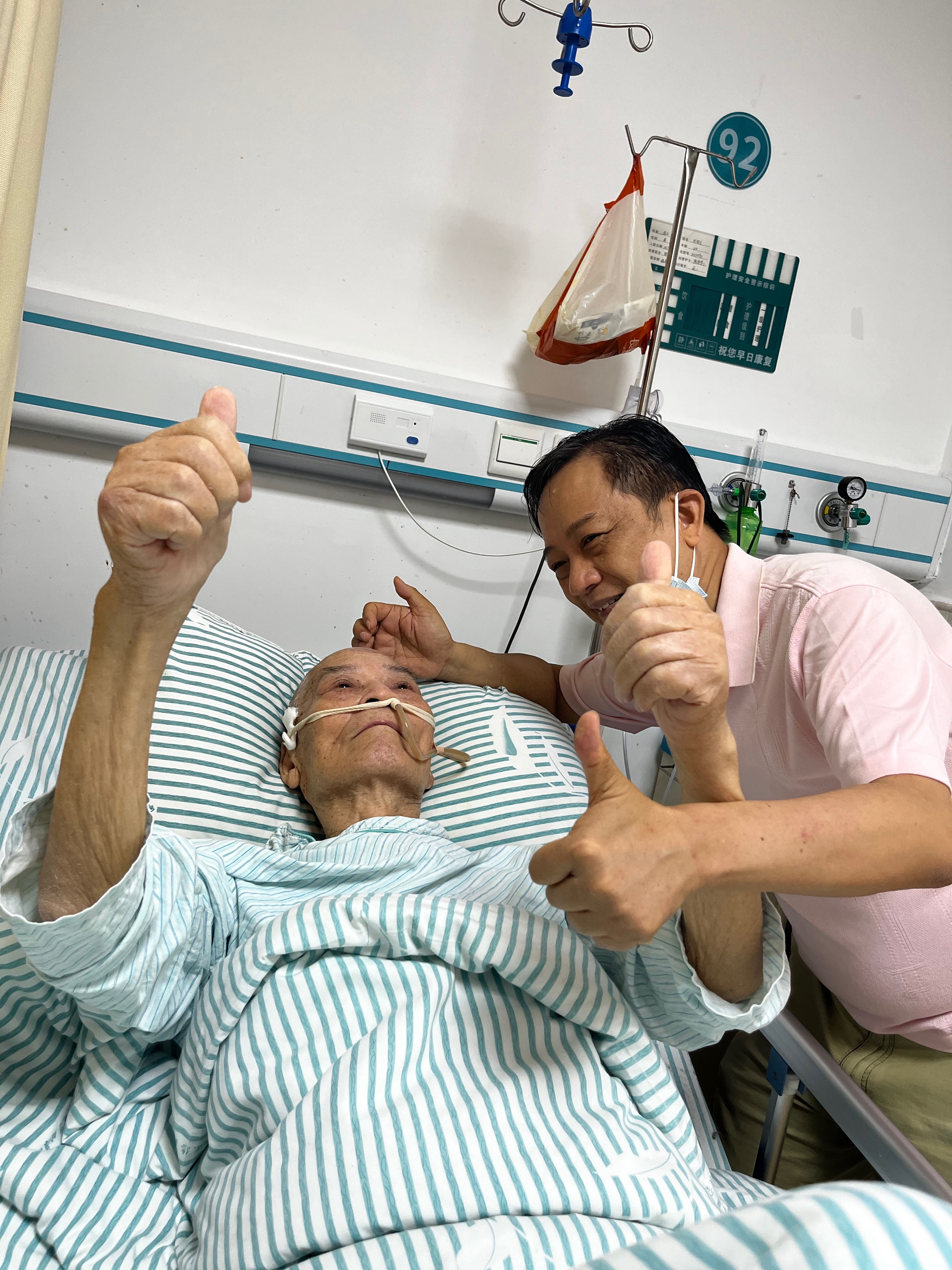 老父“睡醒”后竖起了大拇指