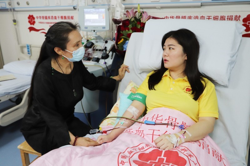 正在进行造血干细胞捐献的刘茜粞(右)和陪伴在一旁的母亲(左) (受访单位供图)